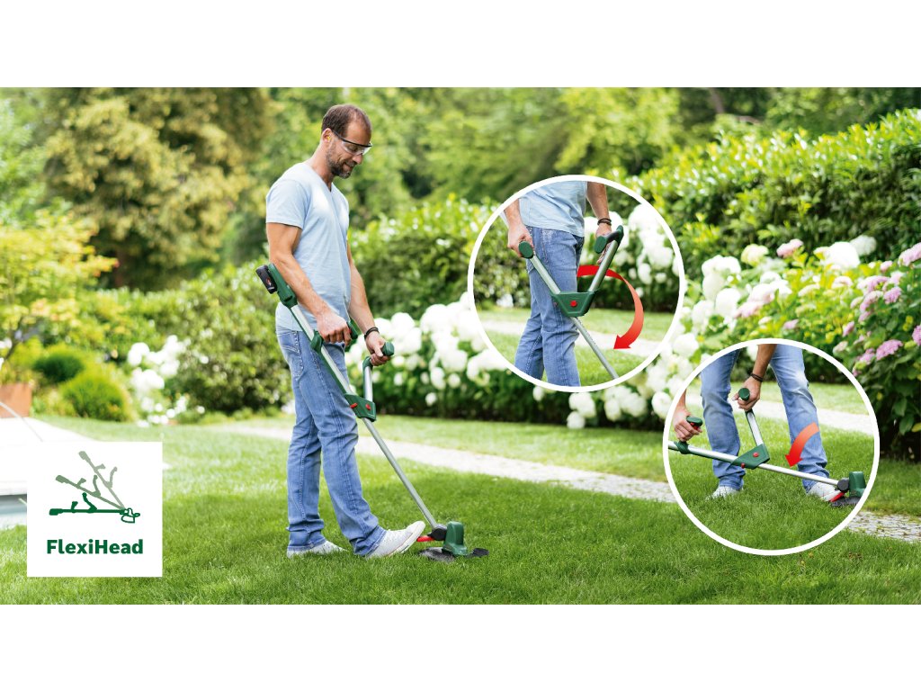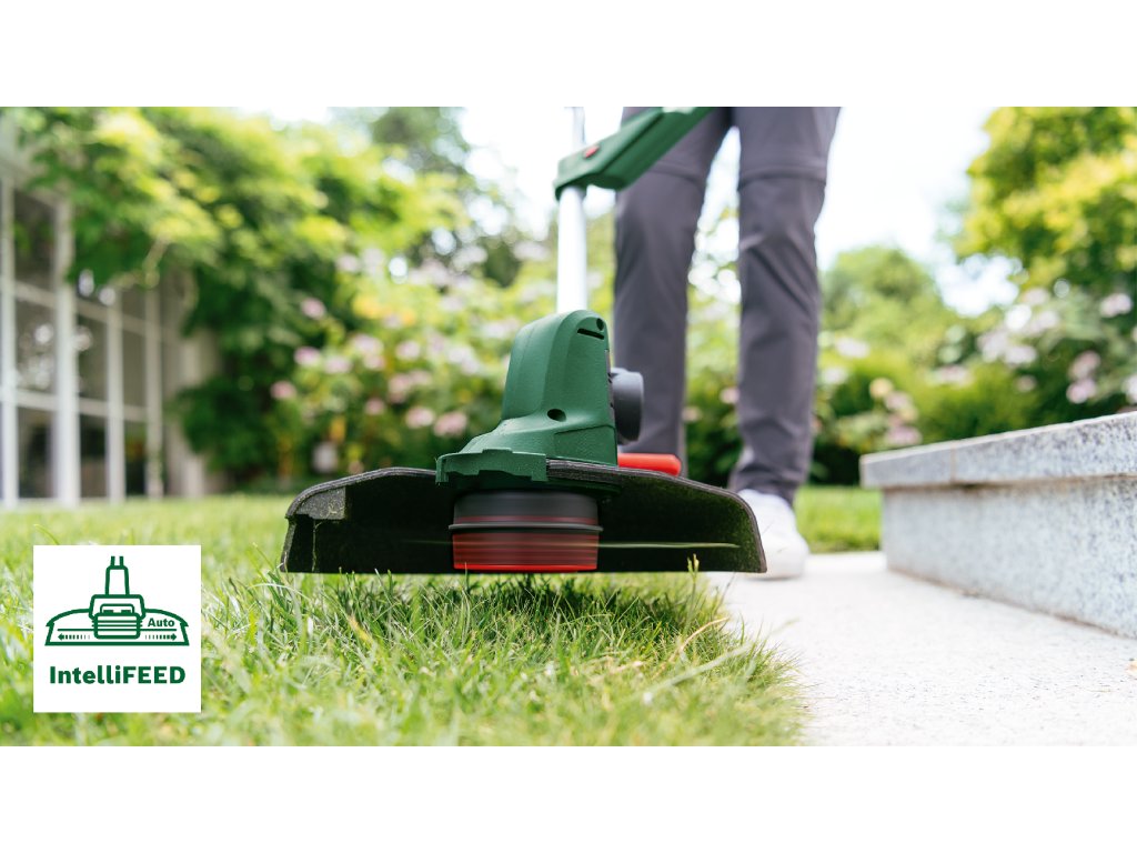 Ergonomický design rukojeti ve tvaru písmene V pro pohodlný postoj při práci. Funkce IntelliFEED automaticky odvíjí strunu pro práci bez přerušování. Všestranná hlava umožňuje náklon a úpravu okrajů bez použití rukou.