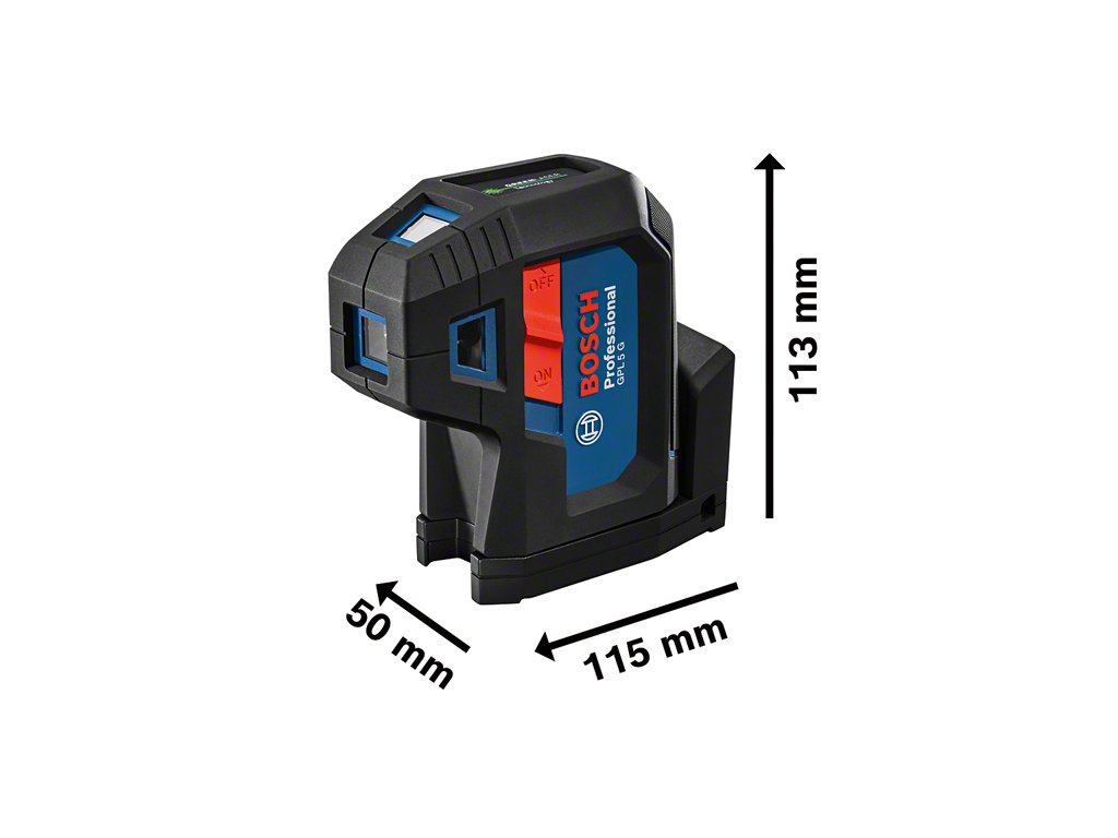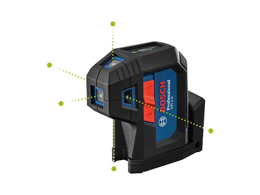 Pětibodový laser GPL 5 G Professional vyniká svou odolnou a kompaktní konstrukcí, díky které je ideální volbou při stavbě vzájemně kolmých stěn. Zelené laserové body poskytují až čtyřikrát lepší viditelnost oproti červeným bodům. GPL 5 Professional se svým pogumovaným krytem, zapuštěným sklíčkem a stupni krytí IP 65 proti prachu a stříkající vodě odolá drsným podmínkám na pracovišti. Tento pětibodový laser je připraven na přepravu během chvilky, a to díky integrovanému otočnému držáku se silnými magnety pro rychlé a bezpečné upevnění nářadí.