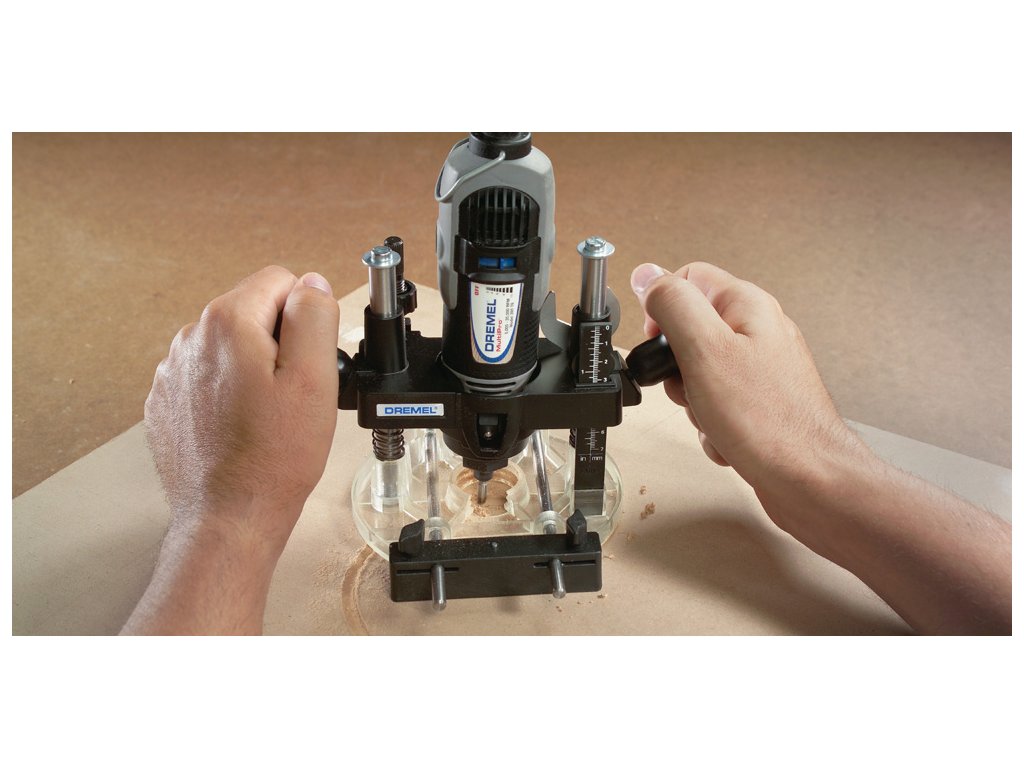 Změní nářadí DREMEL v zapichovací frézku pro frézování kruhů, znaků a intarzií, ozdobných hran a frézování paralelně k hranám.