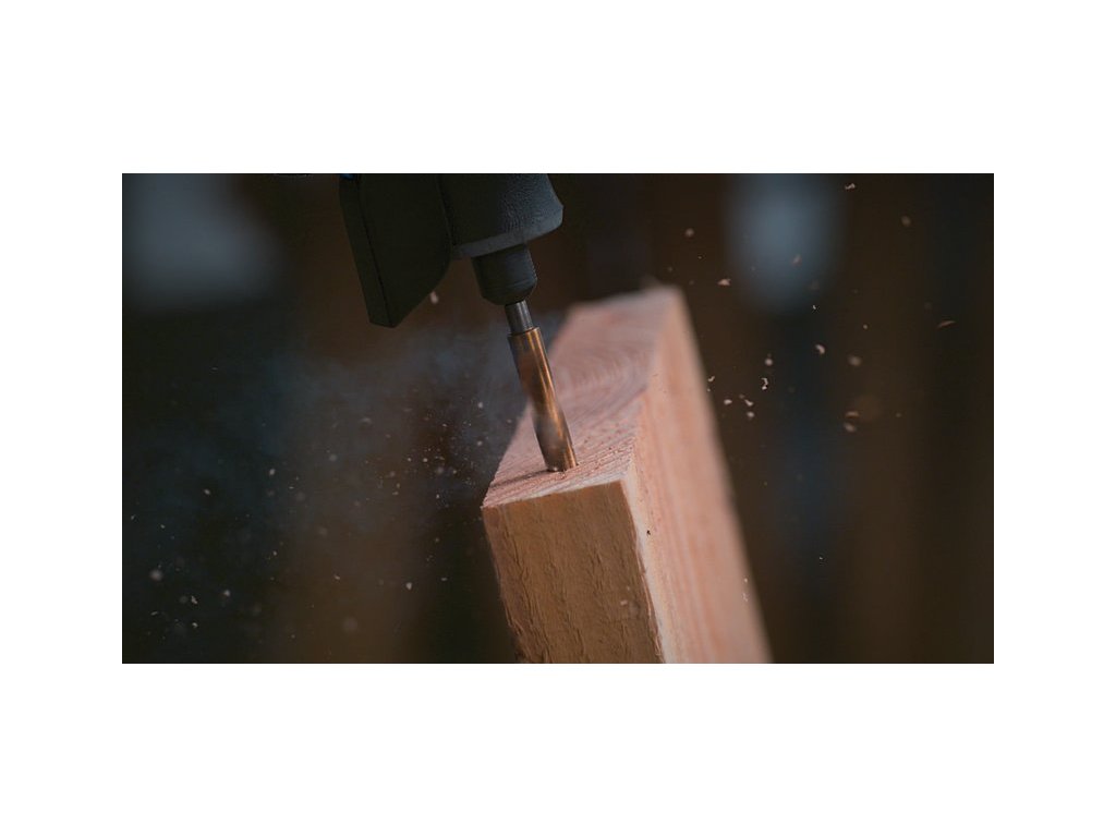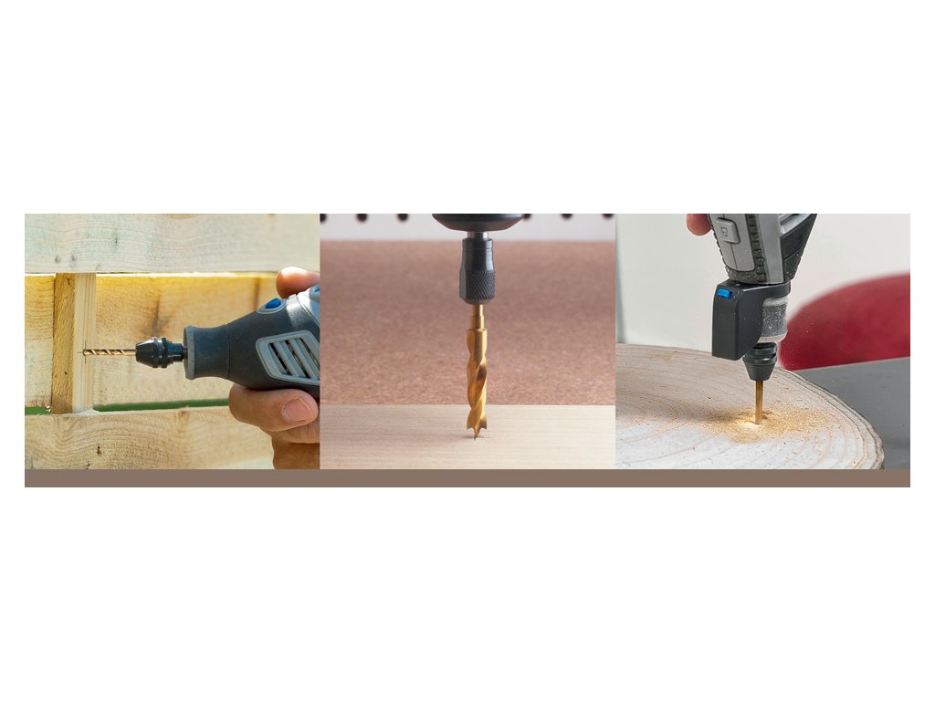 Použití: Jedinečné titanové vrtáky do dřeva, Dremel, o průměru 3, 4, 5 a 6 mm.