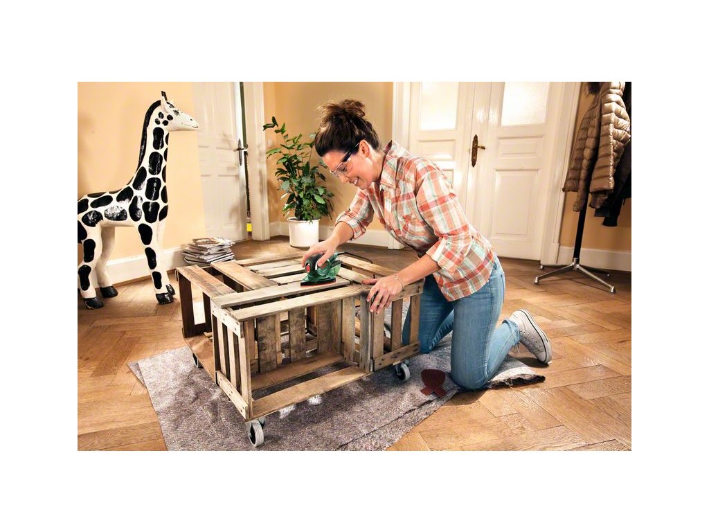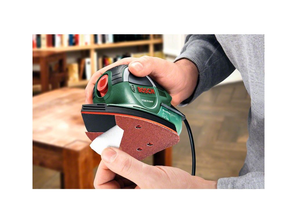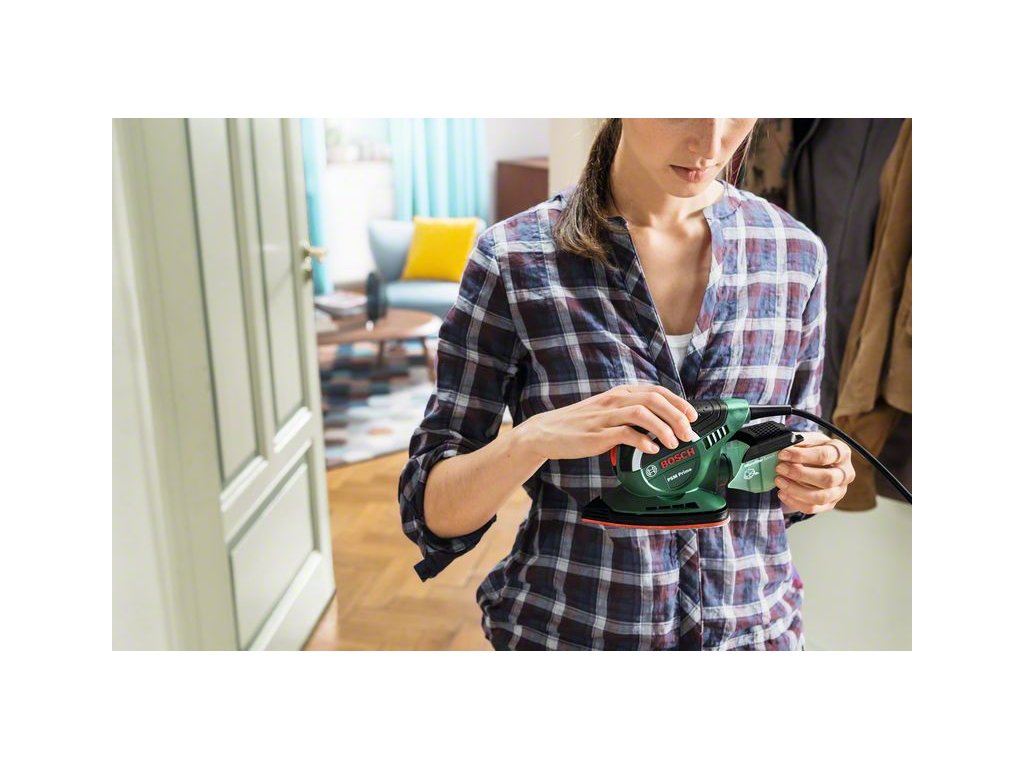 Bruska se vyznačuje dobrým poměrem výkonu a hmotnosti v kombinaci s moderním designem a štíhlým a kompaktním tvarem. Díky výkonu motoru 50 W jde práce s tímto nářadím dobře od ruky. Měkké gumové tlumicí vložky a postranní prohlubně umožňují pohodlné uchopení a vedení jednou rukou. K broušení rohů a hran i menších až středně velkých ploch. Mikrojemný suchý zip pro rychlou výměnu brusného papíru. Mikrofiltrační systém s přípojkou na vysavač pro čistější práci.