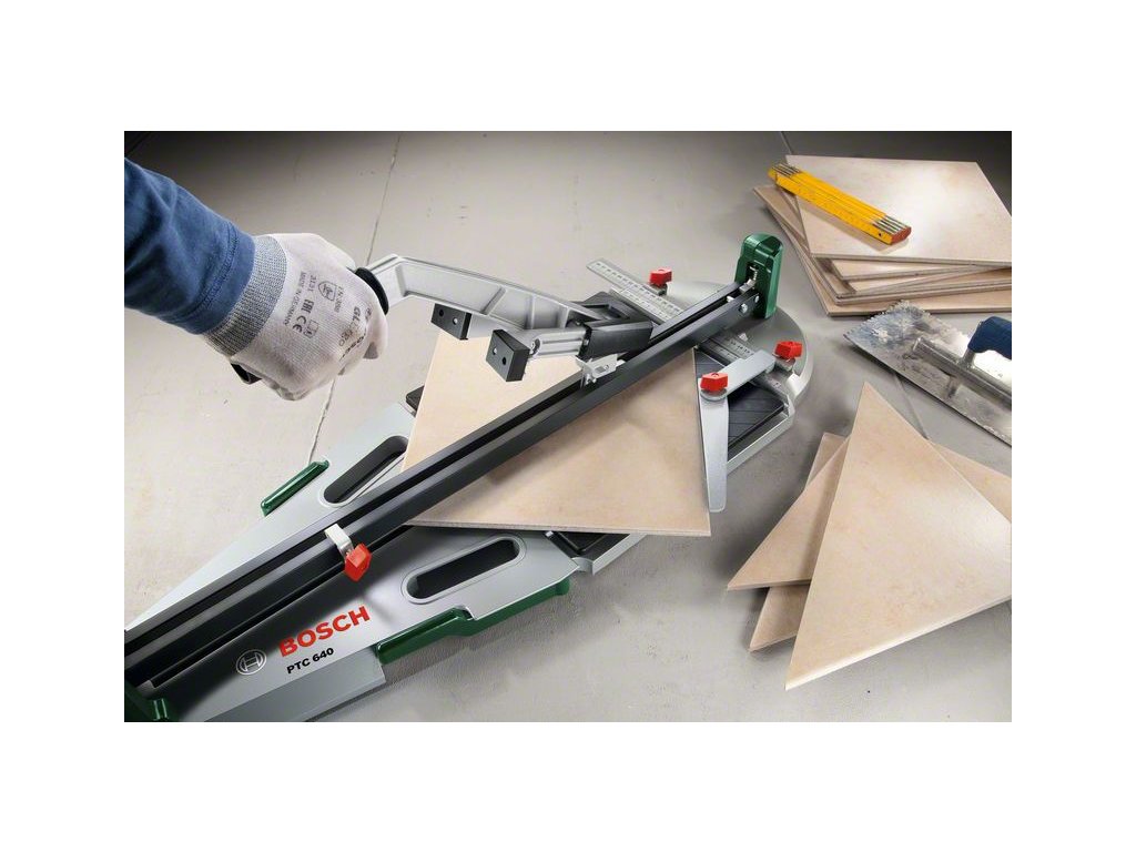 Řezačka na dlaždice Bosch PTC 640 umožňuje jednoduché naříznutí a zlomení dlaždice jen v jednom pracovním kroku. Řezací kolečko s titanovým povlakem a mimořádně dlouhou životností zabezpečuje pohodlné nařezávání řezaných dlaždic. Řezačka na dlaždice řeže rychle a jednoduše dlaždice o délce až 640 mm. Aby nedošlo k ohrožení zdraví domácího kutila, je obrobek mimořádně bezpečně upevněný. Řezačka na dlaždice je dále vybavená rozšířením opěrné plochy, takže je možné pohodlně řezat i velké dlaždice.